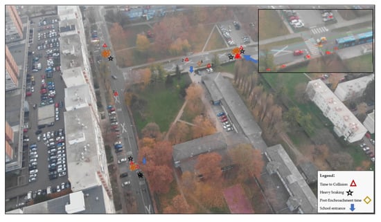 Based on the three safety indicators extracted from the DataFromSky Viewer program, a detailed analysis of potential conflicts around the primary school was made. The trajectories of passenger cars and AT users were extracted, and conflicts were identified. Near collisions between vehicles and pedestrians in DataFromSky were detected using TTC in case vehicles were moving at a constant speed and in a constant direction at the moment of analysis. A limit for time-to-collision of 2 s from the potential collision was established. PET was defined as the time difference between when a pedestrian leaves the conflict zone and a vehicle enters it. This threshold was set at 1.5 s. Heavy braking was defined as deceleration greater than −2.5 ms−2. All of the DataFromSky data were collected in a database which was further analyzed using statistical tools. Based on the three safety indicators, and by reviewing the footage, a total of 43 potential conflicts were identified (14 time-to-collision, 6 heavy braking, and 23 post-encroachment time). Based on a literature review and a review of videos, the threshold values of these safety indicators were determined and are described in the following sections. All determined potential conflicts from DataFromSky Viewer were observed and analyzed from drone footage following the time steps and their location on the network. All potential conflicts marked by three surrogate safety indicators were confirmed as risky via video observation. Figure 4 shows the setup of the investigated school area with the locations of all potential conflicts. Almost all potential conflicts were identified as having occurred on pedestrian crossings. This indicates that most AT users respect traffic rules and use appropriate pedestrian crossings. Four potential conflicts occurred outside of pedestrian crossing areas: three time-to-collision and one post-encroachment time. On the far left TTC point (indicated by the number 1), a pedestrian was crossing the road illegally. The TTC point (indicated by 2) denotes a car–bicycle potential conflict, where the car driver parked at a bus station. The TTC conflict point (marked with 3) denotes a pedestrian–bicycle conflict in front of the school entrance and on the pedestrian sidewalk. The pedestrian density was high, and the cyclist passed them at high-speed. The PET conflict on the pavement (marked with 4) was a car–pedestrian conflict, where the pedestrian was crossing a road outside of the pedestrian crossing area.