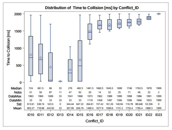 Time-to-collision was the most observed safety indicator in the literature. A value of 1500 milliseconds is most often used when analyzing conflicts between vehicles but, based on the slightly slower vehicle and pedestrian speeds and the video review, a value of 2 s (2000 ms) was applied in this study. The lower the TTC value, the higher the probability of an accident. A total of 14 potential conflicts were identified (Table 2). Figure 5 shows a statistical analysis of time-to-collision (ms). It can be seen that most values are scattered, and only two potential conflicts had a constant value during TTC progression (ConflictID 13 and 23). Rhombus in boxplots represents mean and horizontal lines represents median. Additionally, if the potential conflict has a greater number of observations (ConflictID 12, 15, and 20) then the risk exposure lasts longer and the situation is even more dangerous. TTC conflicts were widely scattered across the studied area, and the majority were located at pedestrian crossings. One can conclude that cars stop too close to pedestrian crossings, which could lead to potentially severe consequences—especially as many children walk on pedestrian crossings near primary schools.