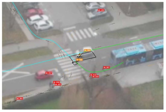 Small values of PET (ms) indicate a greater probability of a collision occurring. In this study, based on the literature review [40] and considering potential AT–car conflicts, a threshold value of 1500 ms was identified as appropriate. A total of 23 potential conflicts were identified (Table 3). The values of 13 potential PET conflicts were smaller than 1000 ms (56.5% of the total), which means that these conflicts were seriously dangerous. From the locations of all post-encroachment time conflicts (Figure 4), we can conclude that most PET conflicts occur on pedestrian crossings, which indicates that drivers are aggressive and do not wait long enough for pedestrians to leave the crossing. This is a potentially dangerous situation because pedestrians can turn abruptly and return via the same crossing.