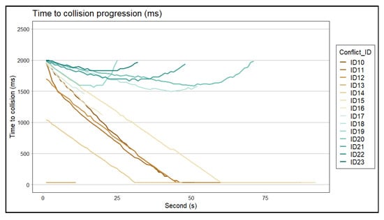 Figure 7 presents the progression of each time-to-collision conflict over time. If the value of time-to-collision decreases sharply, it can be concluded that the situation was extremely dangerous because the distance between the traffic participants decreased and a vehicle was forced to brake suddenly (ID 10, 11, 12, 14, 15, and 16). On the other hand, if the progression is accompanied by a slight or moderate decrease in the value, it can be concluded that the situation was moderately dangerous (ID 18, 19, 20, 21, 22, and 23). Conflict 13 has a constant and very low value, and as such this situation was classified as very dangerous.