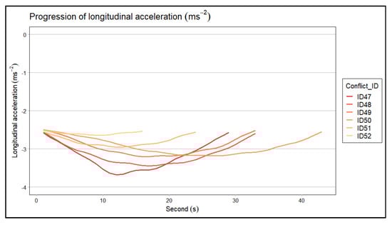 Heavy braking (HB) is used as an indication of rapid deceleration and to detect collisions or dangerous situations. Based on the literature review [41], a threshold value of −2.5 ms−2 was identified as applicable to the analysis in this study, meaning that values greater than −2.5 ms−2 were considered heavy braking, and were consequently considered to be potential conflicts. A total of six potential HB conflicts were identified. The progression of longitudinal acceleration is shown in Figure 8. Conflict ID26 had the highest deceleration values. Additionally, a sharp decrease can be seen for ID26—this conflict was classified as the most hazardous in the HB group.