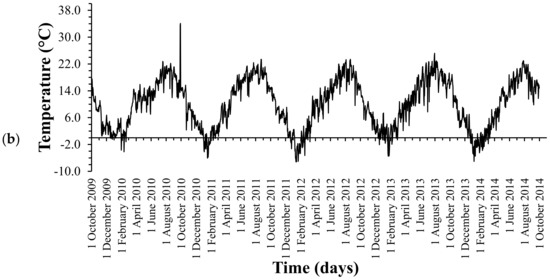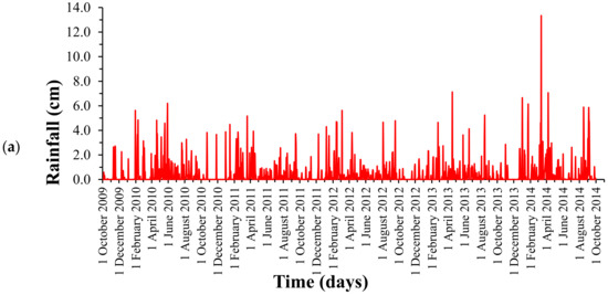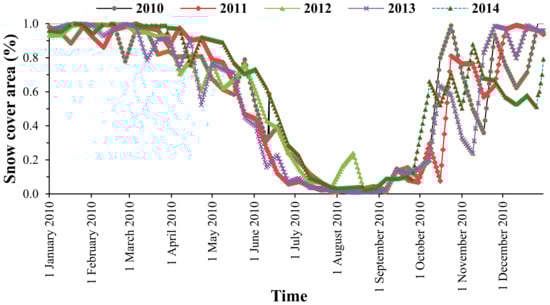 In this study, we utilized MOD10A2, a MODIS snow product that provides information on the extent of snow coverage in a repeating period of 8 days [50]. Mapping snow cover was a time-consuming task in this study, as satellite images were obtained daily and processed for snow-cover extraction if the study region was cloud-free. The file size was excessive, and a significant number of images were necessary. From January 2009 to December 2014, a total of 264 processed MOD10A2 images were gathered from http://nsidc.org/cgi-bin/snowi/search.pl, 12 September 2021. For all the Hierarchical Data Format (HDF) images, Geo-referencing was carried out. The images for the Lidder River Catchment were re-projected in ArcGIS 10.2 using the WGS 1984 Universal Transverse Mercator (UTM) Zone 43N projection method. If the percentage of cloud cover on a certain day surpassed 20%, the record was removed. For that day, the snow coverage was approximated by linearly interpolating the preceding and accessible cloud-free images. The snow pixels were multiplied by cell area and then converted to square kilometers, with each 8-day interval value divided by the area of the basin and interpolated to obtain the value of daily snow cover.