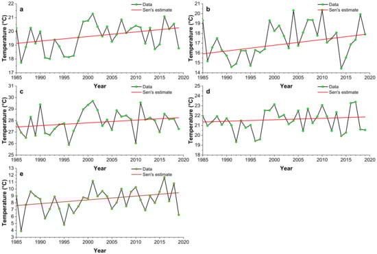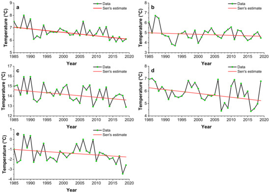 Trend statistics and Sen’s slope in observed seasonal maximum temperatures in the study area from 1985 to 2019. (a) Average annual minimum temperature, (b) Average spring minimum temperature, (c) Average summer minimum temperature, (d) Average autumn minimum temperature, (e) Average winter minimum temperature.