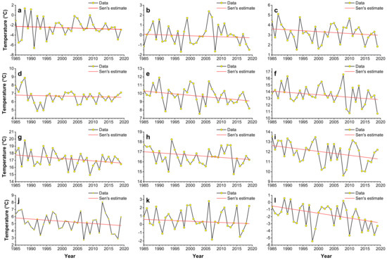 Trend statistics and Sen’s slope observed monthly minimum temperatures in the study area from 1985 to 2019. (a) January, (b) February, (c) March, (d) April, (e) May, (f) June, (g) July, (h) August, (i) September, (j) October, (k) November, (l) December.