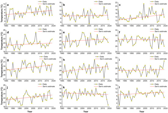 Trend statistics and Sen’s slope observed monthly maximum temperatures in the study area from 1985 to 2019. (a) January, (b) February, (c) March, (d) April, (e) May, (f) June, (g) July, (h) August, (i) September, (j) October, (k) November, (l) December.