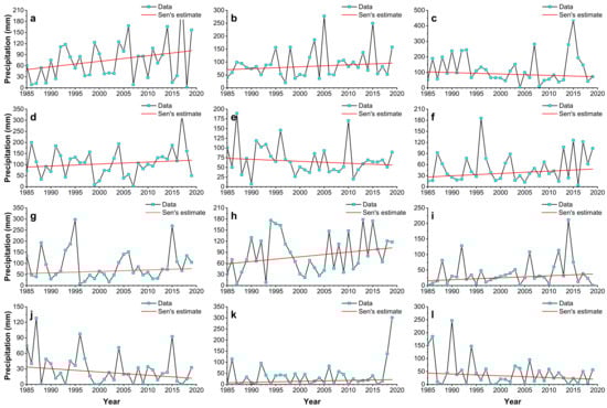 Trend statistics and Sen’s slope observed monthly precipitation in the study area from 1985 to 2019. (a) January, (b) February, (c) March, (d) April, (e) May, (f) June, (g) July, (h) August, (i) September, (j) October, (k) November, (l) December.