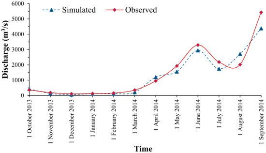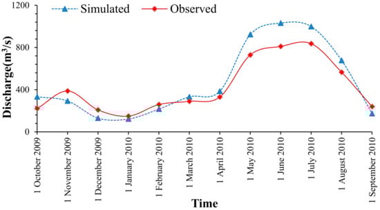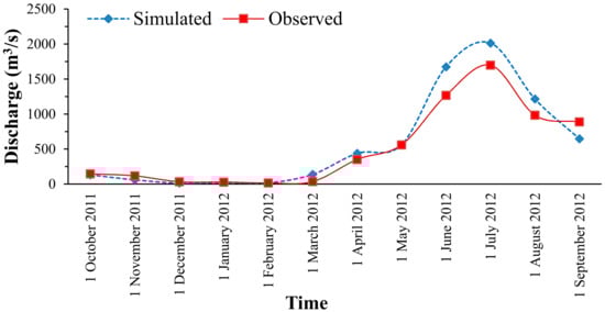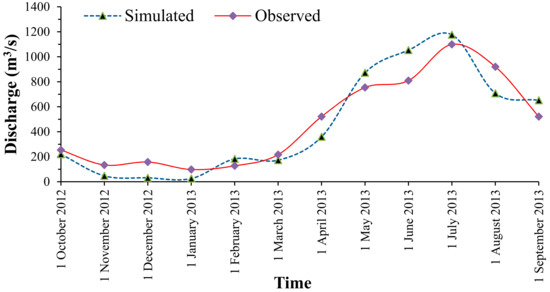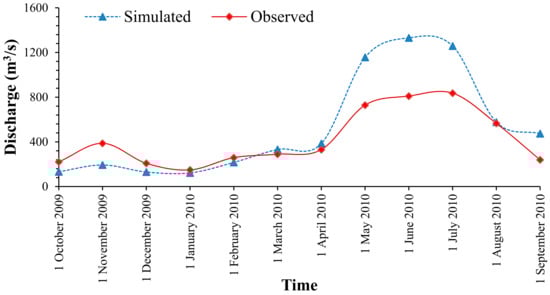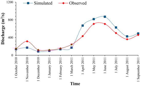 After calibrating the model, it could be transferred to another year by simply adjusting the input data while retaining the calibrated parameters. The model was validated for the hydrological years 2010–2011 to 2013–2014 yearly, with the same parameters used during calibration. The graphical representation between the simulated and observed discharge of the year 2010–2011 is given in Figure 12. It can be observed from Figure 12 that the simulated and the observed values for the discharge are in close agreement. It can be further observed that the highest value of discharge was found in June (869.8 m3/s). During the year 2010–2011, the performance indices were Dv = −10.1% and R2 = 0.92. The model slightly overestimated the discharge value; however, the difference is within reasonable limits. The model validation results show that the simulated and the observed values match well, with the statistical parameters within a reasonable range.