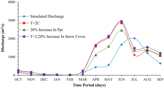 In Scenario B, the results illustrated in Table 5 indicate that a 2 °C increase in temperature increased the average discharge 53% (3476 m3/s) in the summer. The peak discharge was highest in July (2013.44 m3/s). When the temperature changed by 2 °C, the peak discharge was shifted one month to June (2853.29 m3/s). This result indicates that if the rise in the air temperature continues at the rate of 3.7 °C [15], runoff must be carefully managed due to the large volumes of runoff received from the Lidder and its adjoining glacier and snowmelt regions.
