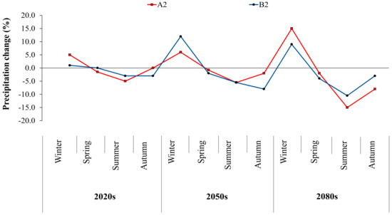 Precipitation changes in IPCC SERS A2 and B2 scenarios from the 2020s through the 2080s.