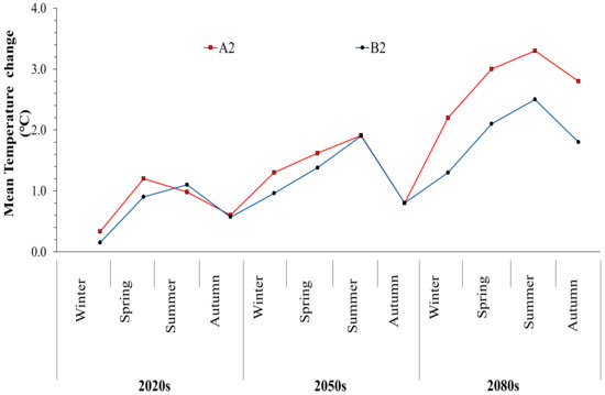 According to Intergovernmental Panel on Climate Change (IPCC) predictions, future climate change brings a variety of repercussions. Figure 17 shows the precipitation changes in the Lidder river watershed under the A2 and B2 scenarios from the year 2020 to 2080. It is indicated that the future annual precipitation in the Lidder river catchment is decreasing. From the A2 and B2 scenarios, it is evident that the monthly precipitation decreases throughout spring, summer, and fall, then has a rising tendency during the winter. Figure 18 depicts the average changes in mean temperature in both scenarios from 2020 to 2080. There is a growing trend in the future mean temperature seasonal. The increasing range under A2 is greater than B2. A similar result was observed in Ungauged Mountainous Watershed, Northwest China, by Ma et al. [57]; in Alberta, Canada, by Jiang et al. [58]; and in the Sutlej River Basin, India, by Singh et al. [59].