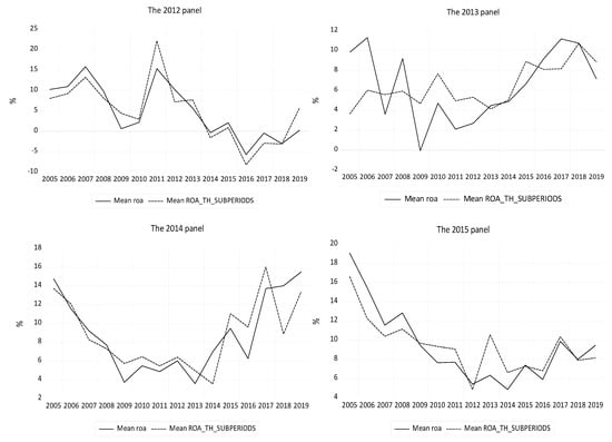 On the basis of the four panels (last column of Table 2), we found that, for the period from 2005–2019, all the Romanian companies that demerged in 2012–2015 had annual average ROAs in a range between 7.3% and 8.8%, with a probability of 95%. Over time, the lower and upper limits of the ROA confidence intervals increased, describing an upward trend in the average ROA values. However, we are interested in the average values of the ROAs in the ante and post subperiods of the demerger years, rather than in the values of the average annual ROAs for the entire period covering the years of the demergers.