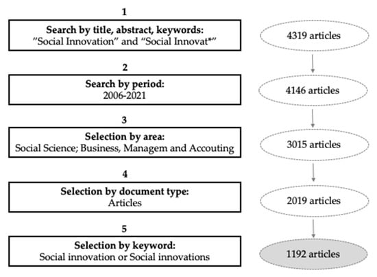 In view of the exponential increase in publications on social innovation in the last decade, it was decided to carry out a bibliometric survey, with an exploratory-descriptive characteristic, specifically covering the period 2006–2021. The restriction on the time interval was justified due to the concentration of approximately 91% of the total publications in this period. Given the importance of data collection and processing, in using this research technique, data indexed by the SCOPUS database were used, as this included journals with a high impact factor. Figure 1 summarizes the search parameters used.