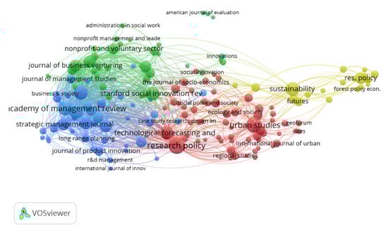 This analysis allows knowing the structural connections of a field—the proximity, association, and dialogue established between documents and researchers. By analyzing the clusters and journals with the highest number of citations (Figure 4), it was possible to see that they are connected to four different theoretical domains: (1) The green cluster, denominated “social entrepreneurship and the third sector”: Entrepreneurship Theory and Practice (287 citations), Journal of Business Venturing (249), Journal of Social Entrepreneurship (225), and Nonprofit and Voluntary Sector Quarterly (200); (2) the blue cluster, denominated “strategic management and innovation”: Academy of Management Review (359 citations), Academy of Management Journal (323), Journal of Business Ethics (321), Strategic Management Journal (234); (3) the red cluster, denominated “sociopolitical aspects, urban development and governance”: Research Policy (473 citations), Urban Studies (404), Stanford Social Innovation Review (324), and Technological Forecasting and Social Change (303); (4) the yellow cluster, denominated “innovation and sustainability”: Sustainability (327 citations), Journal of Cleaner Production (198 citations), Futures (144), and Technovation (128).