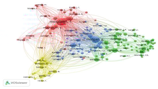 A total of 53,614 authors were cited, with Moulaert being the most cited author (942 citations), followed by Mulgan (739), Nicholls (359), Howaldt (352), Swyngedouw (313), and Maccallum (273). Figure 5 illustrates the co-citation network between authors, featuring four clusters, and the most cited authors, according to the size of the circle. In order of the number of components, the first cluster is green with 67 authors, the second is blue with 53 authors, the third is red with 34 authors, followed by the yellow cluster with 18 authors. The co-citation map was established with a parameter of a minimum of 50 citations per author and resulted in a total of 174 authors.