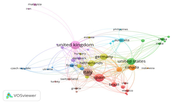 The analysis of co-authorship between countries allows for a demonstration of the structure of collaboration networks and partnerships in research, providing the identification of collaborations between countries and institutions. This type of analysis has been widely used to understand and assess patterns of scientific collaboration. The map generated by the VOS shows the dispersion of the field, led mainly by six countries: United Kingdom (165 documents, 4163 citations), Spain (150 documents, 1899 citations), Italy (143 documents, 1154 citations), United States (109 documents, 2461 citations), Germany (98 documents, 1906 citations), and Canada (83 documents, 1114 citations), which are the countries that lead the main research centers in the field.