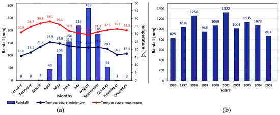 Characteristics of climate for the Zaria region (data obtained from the Samaru weather station [28]); (a) total monthly rainfall, minimum and maximum temperatures throughout the year (b) mean annual precipitation; the values presented as average for period 1996–2005.