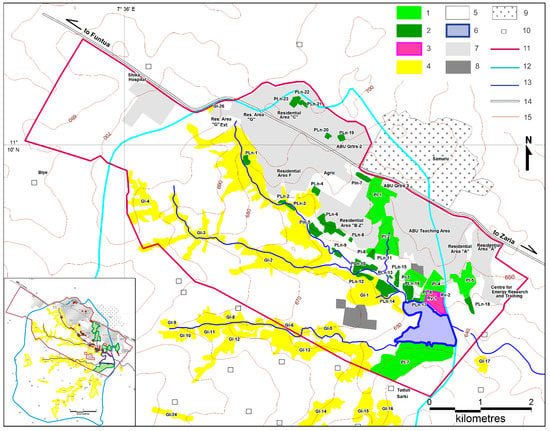 The study area consists of the land owned by Ahmadu Bello University in Zaria (ABU), i.e., the main campus together with its vicinity; some research activities also concerned areas outside the ABU territory. The study area is located 12 km west of the city of Zaria (Kaduna State) (Figure 1), in the northern part of Nigeria, characterized by a tropical savanna climate. The ABU land under study with a total area of about 30.2 km2 (3020 ha) is divided into the well-developed, northern part, covering approximately 0.9 km2 (900 ha), called the main campus and hospital area, i.e., 30% of the total University area, and the part not used for academic purposes (southern), which is 21.20 km2 (2120 ha) or 70% of the current total area. The developed part, which may be considered urbanized, comprises the land and buildings used for teaching, administrative and housing purposes, while the undeveloped part comprises farms, wild shrub vegetation, eroded barren land, covering significant part of the catchment of the Kubanni stream flowing in the area. One of the major elements of the natural environment in the study area is the Kubanni impounding reservoir, constructed on the stream in the land belonging to the University.