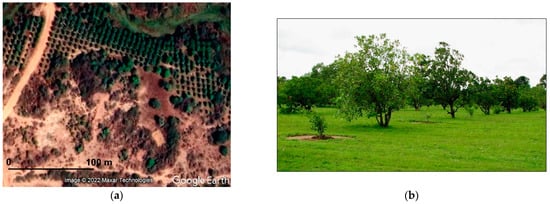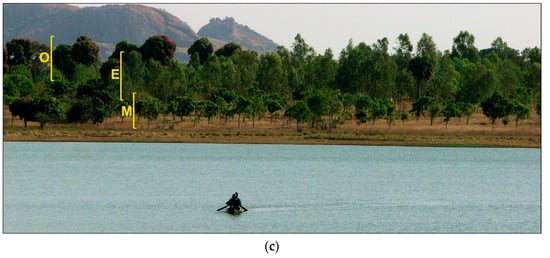 Figure 5. Plantations in the Ahmadu Bello University grounds: (a) high-resolution image available in Google Earth (Image © 2022 Maxar Technologies) [29] presenting new plantings (Pln-14 in Figure 4) on the edge of the land affected by erosion; (b) a photograph of the section planted with cashew trees aged several years; (c) a view of the Kubanni reservoir shore overgrown with layers of vegetation (Pl-7 in Figure 4): in the foreground are the youngest mahogany trees (M), behind—the older eucalyptus trees (E), in the background is the oldest tree generation (O) (Photos by E.E. Kurowska 2008). - Areas of new plantings (after 2008), marked as PLn, observed on the high-resolution Google Earth image in 2020, of which total area is approximately 0.6 km2 (60 ha) (Table 3). In the period from 2008 to 2020, the area planted with mahogany was 3.11 ha, mahogany together with other species (black plum, date palm, oil palm, white teak) 16.69 ha, black plum 4.4164 ha, mango 21.73 ha, white teak 8 ha, guava 1.663 ha, guava mixed with other species (cashew, mango and eucalyptus) 2.63 ha, eucalyptus 1.7485 ha;