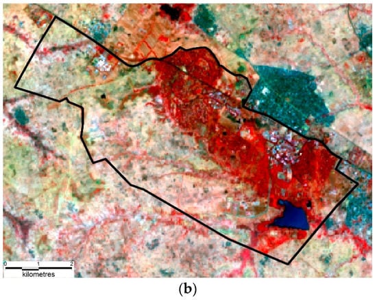 A comparison of the spatial distribution of vegetation cover in Landsat 7 image from 2000 (bands 432, image (a)) and Landsat 8 from 2020 (bands 543, image (b)) [30], in both cases, data were collected at the end of April (04.27 and 04.28, respectively. Such band combinations display vegetation as red colour. Due to the season when satellite data were collected, greenery is largely represented by trees (Landsat 7 data acquired on 28 April 2000 and Landsat 8 acquired on 27 April 2020). The boundary of the study area (land owned by ABU) is indicated by a black line (comparison with the land-use map in Figure 4). A significant increase in wooded land over the time period from 2000 to 2020 is evident.