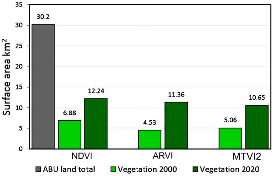 The other indices chosen for the analysis showed a slightly lower area covered with vegetation (Figure 7). ARVI 2000 and 2020 gave a range of values from −0.5202 to 0.5196 and −0.5992 to 0.5508, respectively, and the vegetated area was classified with values above 0.0; for the MTVI2 2000 and 2020 the ranges of values from –0.2643 to 0.4326 and from −0.2665 to 0.3570 were obtained, and the vegetation cover was marked with values above 0.016. Thus, the ARVI calculations resulted in area covered with vegetation, mainly afforested, of 4.53 km2 in 2000 and 11.36 km2 by 2020, and MTVI2 5.6 km2 and 10.65 km2, respectively. The differences arose, among others, from the fact that NDVI represented vegetation with a greater share of low vegetation cover, especially in wet regions: in the valleys of watercourses, irrigated areas and specially the shores of the lake, whereas ARVI and MTVI2 were more sensitive to background and are probably better at separating soil and grassy vegetation from wooded areas. Moreover, some difficulties in classification resulted from the fact that some built-up areas of the ABU were also densely wooded. Generally, considering all the three vegetation indices, it can be concluded that the vegetation cover, mainly wooded vegetation, more or less doubled in the period from 2000 to 2020.