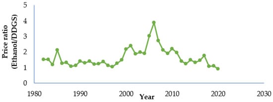 Historic price ratio of DDGS and ethanol in the U.S.A. market. Data from ref. [].