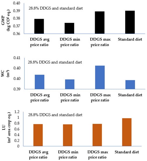 Environmental footprint results from Table 6 demonstrated that GWP, LU, and TE were reduced with the increase in DDGS inclusion in the diets, while FR showed a trend of decline as compared with the standard diet. The highest environmental footprint reduction was attained with a 28.8% DDGS diet, which was 9.69% GWP, 22.97% LU, 2.36% WC, 20.3% TE, and 1.74% FR lower than the standard diet. A high FR footprint was attributed to the high energy requirement for the drying process of DDGS.