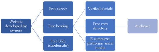 The online presentation of tourism offer evolves with ICT as all businesses with online presence try to follow the change, owners of rural tourism facilities included [5,9,10]. However, it can be expensive to upgrade a website or replace it with a new one, a cost not negligible for small businesses. Therefore, owners of tourism facilities in Poland were keen on free hosting from 2000 to 2015 [1]. They used free servers to publish websites they built themselves. They were usually nonprofessional, static sites with basic contact data. Free URLs of such websites (mainly in a subdomain) were posted in free web directories and vertical portals (Figure 1). Proprietary e-commerce platforms or social media were used much less frequently. Even though it was difficult to evaluate the performance of such promotion, it was a prevalent approach [1].