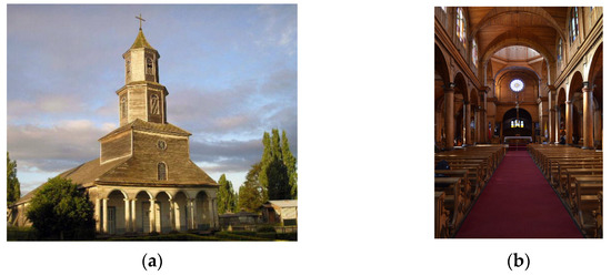Examples of Chilean wooden churches [4]: (a) facade; (b) inner view.
