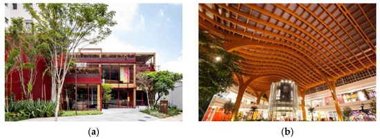 Brazil has a long tradition of construction with concrete, but the use of timber for roofing structures is common. In the southern part of the country, where there is a strong colonization influence from Germans, Austrians, and Hungarians, there are some examples of ancient wooden buildings [32]. Specific educational programs completely dedicated to timber construction do not exist. Some universities offer classes in timber construction and structures in architecture and engineering, but there is a lack of it in most curricula. Some universities with a tradition in timber construction classes include the University of São Paulo, the University of Brasília, Federal University of Santa Catarina, Mackenzie Presbyterian University, and Federal University of Minas Gerais. Recently, there has been an increase in the number of timber construction companies using glulam and CLT techniques, and more examples of buildings with larger spans and heights. However, the tallest wood-framed building ever made in Brazil has only four floors. Two remarkable demonstrative timber buildings in Brazil are the social light-frame housing building in Pinhais City in Paraná State and the Dengo chocolate factory building with CLT and glulam in São Paulo City. The timber structure with the largest span in Brazil is in Shopping Iguatemi in Fortaleza (See Figure 3), which comprises a glulam roof with a 48 m span and 18 m height [33,34].