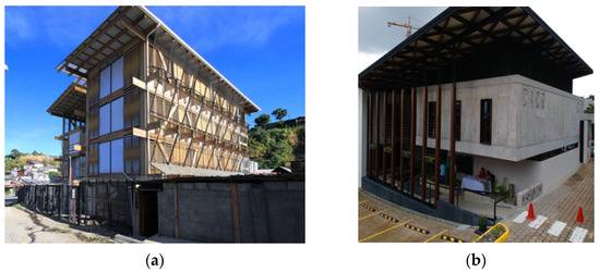 Examples of timber structures in Costa Rica: (a) Cueva de Luz building in San José; (b) Casa 5 at the Engineers and Architects Federation of Costa Rica.