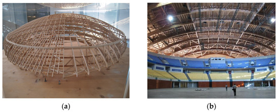 Example of timber structure in Portugal: (a) Altice Arena (Utopia) structural scale model; (b) Altice Arena, inner view.
