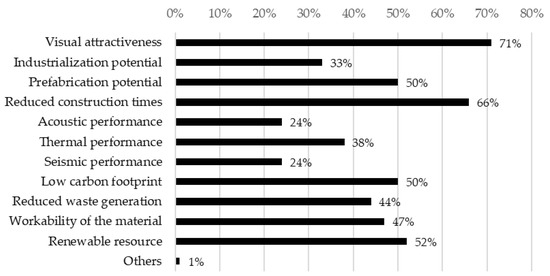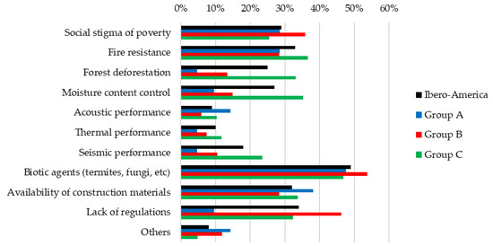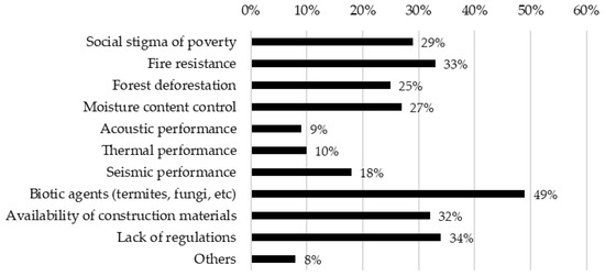 About the perception of its use in construction, of the total number of respondents, 47.4% expressed a preference for wood for the acquisition of their own personal dwelling, 47.9% preferred reinforced concrete, and 35.1% preferred masonry. These results varied when asking about the acquisition of an apartment in a high-rise building, as 30.8% expressed a preference for wood, 57.3% preferred reinforced concrete, and 25.2% preferred masonry. Figure 13 shows the results regarding the perception of the main advantages of wood construction. The results reveal that the three most valuable attributes of timber construction included the visual attractiveness, reduced construction times, and its being a renewable resource, with 71%, 66%, and 52% preference, respectively. Conversely, the results of the main disadvantageous attributes of wood construction are shown in Figure 14. Here it can be identified that for the total number of respondents, the three most relevant drawbacks of timber construction were the vulnerability to biotic agents (termites, fungi, etc.), lack of regulations, and fire resistance, with 49%, 34%, and 33% preference, respectively.