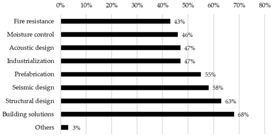 Regarding the use of the material, 53.2% of the respondents stated that they had basic knowledge of the use of timber in construction, whereas 33.1% had intermediate knowledge and the other 13.7% had advanced knowledge. Of the total number of respondents who indicated a basic level in the use of wood, 62.3% corresponded to people between 18 and 37 years of age, 27.5% to people between 38 and 51 years of age, and 22.2% to people over 52 years of age. The knowledge was partly associated with the use of wood in their professional practice, since 28.6% of the total number of respondents had used the material for some structural purpose, such as beams, columns, and light-frame, or laminated elements, among others; 26.5% of the total had used timber in the manufacturing of furniture, 16.7% had used timber only in finishes, and 44.9% had not used it in their projects at all.