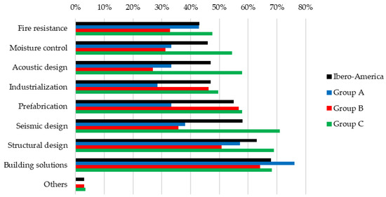 Together with the total analysis of the Ibero-American results, a comparative analysis of these results with the results at the regional level was carried out based on the groups in Figure 2 in order to identify possible gaps at the cultural or geographic level. For this purpose, group A, corresponding to Spain and Portugal, was identified as the European group of the region. Then groups B and C, composed of the Latin American countries, were identified. The grouping of countries into groups B or C depended exclusively on the geographical area of the region and the proportion of land covered by forest plantations [3], according to Figure 2. Thus, group B was composed of the southernmost countries of America: Argentina, Chile, Paraguay, and Uruguay, which share a proportion of land covered by forest plantations of less than 50%, whereas group C, composed of Brazil, Colombia, Costa Rica, Ecuador, El Salvador, Guatemala, Mexico, Panama, and Peru, exceed 50% of land covered by forest plantations.
