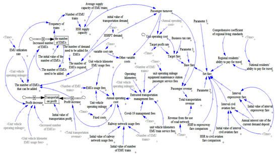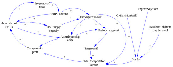 - “Passenger turnover → + Annual operating costs → + Unit operating cost → + Target tariff → + Total transportation revenue → + Transportation profit → + the number of EMUs → + HSR supply capacity → + Passenger turnover”