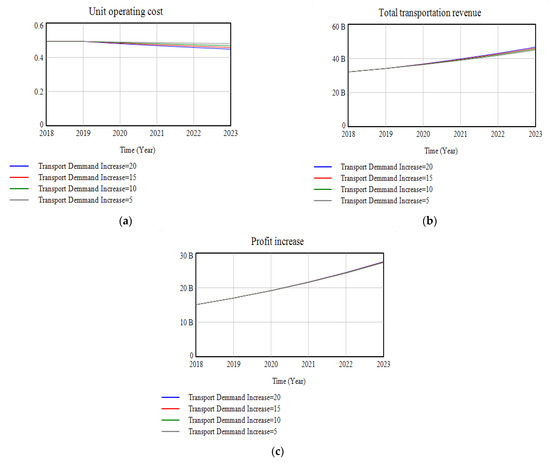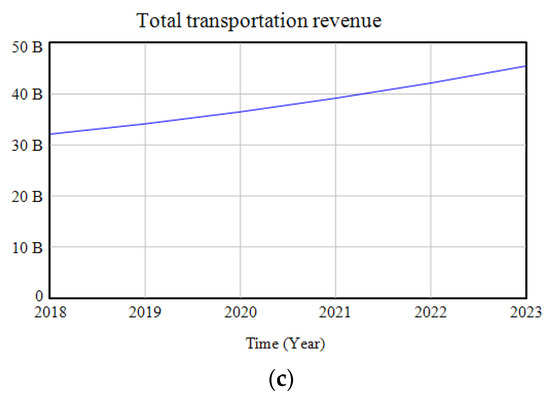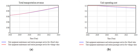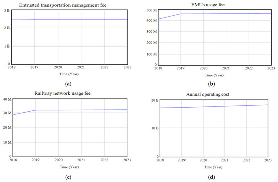 Without considering COVID-19, the annual growth rate of the simulation results of SD in Table 6 shows that the sustainable development capacity of the Beijing–Shanghai HSR keeps a steady improvement year by year. The indicators of total transportation revenue, annual operating costs, transportation profit and passenger turnover et al. Table 6 show a strengthening trend of development. In the past six years, the rate of transportation revenue and transportation profit growth rate has been constantly improving. Transportation revenue will reach 8% in 2023, and transportation profit growth rate will reach 12.73%. The passenger turnover increases year by year, but the unit operating costs decreases. Unit operating costs will drop to 0.470 in 2023, which means the Beijing–Shanghai HSR will generate more revenue at lower costs. The increase in profit and the decrease in operating costs indicate that the passenger transport of the Beijing–Shanghai HSR under the entrusted management operation mode has good sustainability.