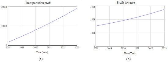 In Equations (1) and (2), the HSRPT demand (D) is gradually increasing year by year above the initial value (ID), the annual growth rate is set as a constant K, and the transportation profit (TP) also changes over time above the initial value (ITP). This is a cumulative amount. In Equations (3) and (4), the annual transportation profit is expressed as Profit Increasing (PI) for Transportation, the difference between total annual transportation revenue (TR) and annual operating costs (C), and the cost of increased demand for EMUs due to annual passenger turnover, causes a profit decrease (PD). Additionally, 365 * increased number of EMUs (IN) * EMU utilization rate ( represents increased numbers of EMU trains (INT), and M represents Unit vehicle operating mileage and UVF represents Unit EMU vehicle kilometer usage fees and M UVF represents Unit EMU usage fees (UUF).