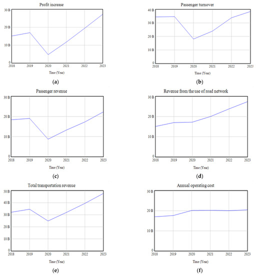 Simulation results under the impact of the pandemic: (a) profit increase; (b) passenger turnover; (c) passenger revenue; (d) revenue from the use of network; (e) total transportation revenue; (f) annual operating cost.