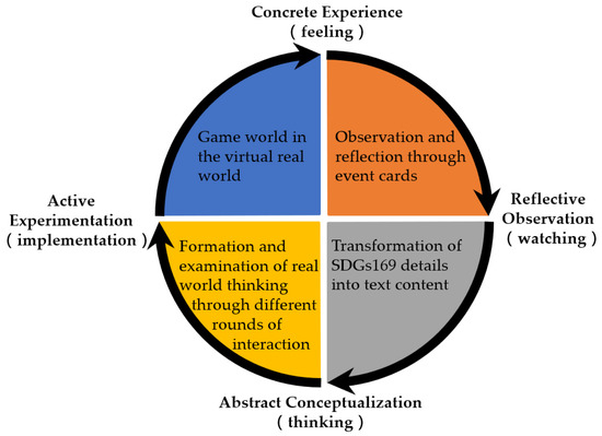 Herein, students assumed the role of national leader. With SDG implementation as the main task, they participated in collaboration, discussion, and research, analyzing the adoption of various cross-domain policies on the game cards. The game allowed learners to undergo the experiential learning cycle proposed by Kolb: the processes of concrete experience, reflective observation, abstract conceptualization, and active experimentation (Figure 1).