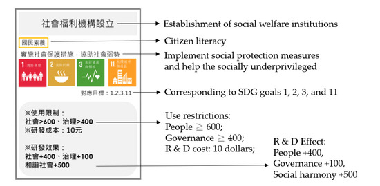 Development cards (Figure 2 presents a development card representing the establishment of social welfare institutions and indicating correspondence with Goal 1, 2, 3, and 11.).
