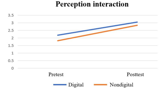 The pretest and posttest scores were organized into interaction graphs and are presented in Figure 6, Figure 7 and Figure 8. Moreover, the questionnaire results were submitted to a paired sample t-test, and the test results were organized according to the categories of perception, knowledge, and attitude, as presented in Table 2, Table 3 and Table 4. Interaction graphs (Figure 6, Figure 7 and Figure 8) revealed that both the digital and non-digital versions of the game resulted in improvements to perception, knowledge, and attitude regarding SDGs. Overall, the participants expressed that the game allowed them to become more familiar with the SDGs.