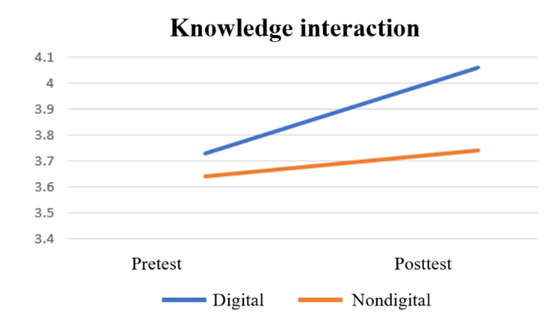 Table 3 presents the results of the paired sample t-test for the knowledge difference between the non-digital and digital board game groups. A significant difference in knowledge between the pretest and posttest in the following groups were observed: senior high school (p < 0.001, d = −1.160) used the non-digital version and primary school (p < 0.001, d = −1.307) and senior high school (p < 0.001, d = −1.731) used the digital version. Figure 7 depicts no progress differences in the knowledge interaction before treatment. Moreover, the difference between the digital and non-digital groups in the posttest was significant.