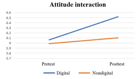 Table 4 presents the results of the paired sample t-test for the attitude difference between the non-digital and digital board game groups. Significant differences in attitude between the pretest and posttest were observed in the primary school group (p = 0.004, d = −0.438) and senior high school group (p < 0.001, d = −3.671) using the digital version. Figure 8 depicts no progress differences in the attitude interaction before treatment. Moreover, the difference between digital and non-digital groups in the posttest was significant.