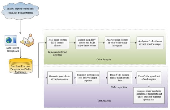 As Figure 2 illustrates, a data-analysis pipeline was established to scrape images, caption content, and comments from each brand using the official Cloud API of their official brand Instagram accounts. Specifically, all visual and textual information posted during 2017 was extracted and inputted into the pipeline. Several images were excluded, as they only featured text without any image information. After cleaning the data, we leveraged several data-mining algorithms to analyze all images and text in the cloud. A total of 320 pictures and post captions were crawled from Everlane, 300 from Patagonia, and 905 from Stella McCartney. On the other hand, 140,735 comments were scraped: 24,055 from Everlane, 41,719 from Patagonia, and 74,961 from Stella McCartney.