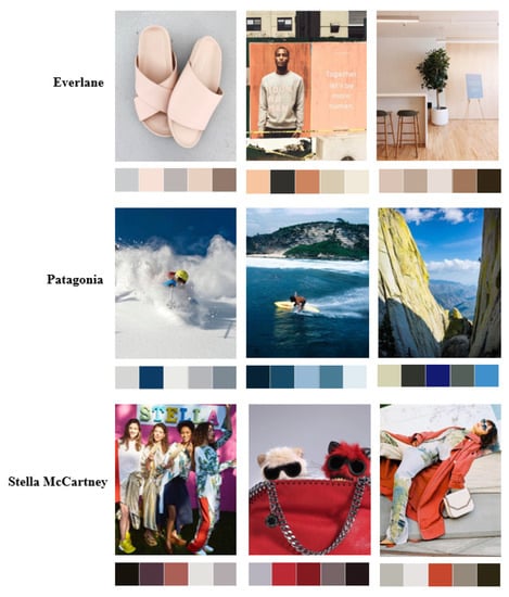 Three images were randomly selected from each brand’s posts, and the five color clusters of the images are shown in Figure 3 as examples of the brief color themes of the three brands. The colors are displaced by descending scores. Hence, the color clusters of the Everlane images present mainly neutral colors focusing on lifestyle images. The color clusters of the Patagonia images mainly feature white, dark blue, and bright colors, as their images consist of landscapes and scenery, while the Stella McCartney images present a variety of colors concentrating on their products.
