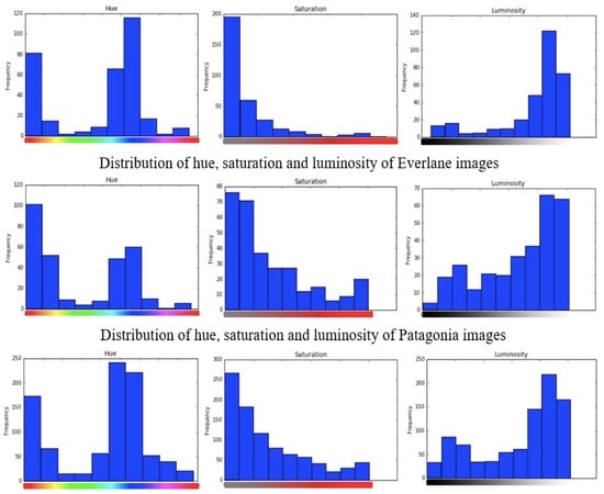 Figure 4 indicates the details of the color features for each brand using histograms, which explain the distribution of hue, saturation, and luminosity, respectively. When the saturation is 0, the color is pure neural. As shown in Figure 4, the x-axis is the 10 bins of the dominant value of hue, saturation, and luminosity in each image, while the y-axis reflects the frequency of images for each brand. A neutral color represents a color with no identifiable hue; pure neutral colors are usually white, black, or gray.