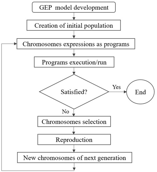 GEP is a computer-based program that imitates the biological system to model some phenomena. This efficient expression–mutation system was first developed by Candida Ferreira back in 2001 [48], and allows the encoding of expressions for the rapid application of a wide range of cross-breeding and mutation techniques. GEP is an enhanced form of the genetic algorithm (GA), which is known as evolutionary computing. These evolutionary algorithms are based on Darwin’s theory: “survival of the fittest” [49]. In GEP, the chromosome (also known as genome) is comprised of one or more genes in a linear string of fixed length. The individual gene is also of fixed length and composed of primitives, which may be a terminal or a function. In the GEP process, a function can accept an argument and return a result after evaluation, while a terminal represents a variable or a constant in a given program. In the GEP process, a gene can be distributed into two parts. The first one is called the “head”, which is formed by terminals and functions, while the second part is known as the “tail”, which is formed by terminals only. Moreover, GEP uses the arbitrary population of individuals, adopts the fitness criteria for selection, and introduces a variation in genes based on genetic operators. GEP has the ability to quickly mutate expressions in the way it encodes various symbols in genes. In the present research, the GEP method was applied using GeneXpro 5.0 software tools developed by Gepsoft Limited located in Portugal. It is a freely available software package which can be used for genetic-based algorithms. The flowchart of the GEP process is illustrated in Figure 1.