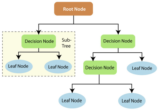 The RF is a machine learning (ML) technique that is mainly used to solve regression and classification-based problems. The RF method is based on an ensemble approach, which combines many classifiers to solve complex problems. The bagging method is usually used to train the RF algorithm, which is an ensemble technique for improving the accuracy of ML models. The RF algorithm is comprised of many decision trees, which is a basic building block of this algorithm [19]. A typical decision tree is comprised of three basic nodes: root node, leaf node, and decision node. The algorithm of the decision tree distributed a dataset into various branches, which further divided into various branches. The process of segregation into sub-branches continues until a leaf node is reached, after which no further distribution is possible. Figure 2 shows the different types of nodes in a decision tree.