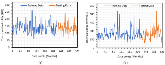 Observed data used for models training and testing: (a) Total Dissolved Solids (TDS); (b) Electrical Conductivity (EC) of the Bisham Qilla station on Upper Indus River.