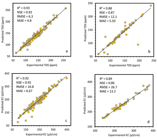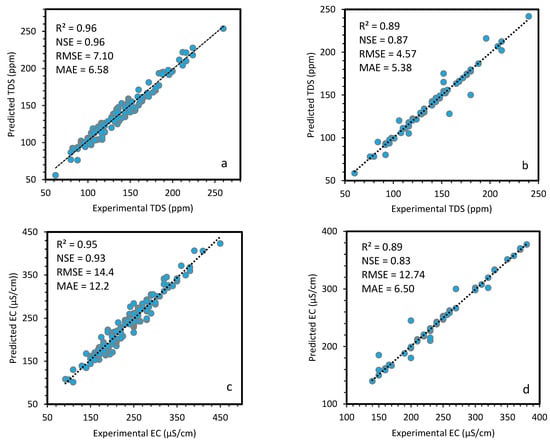 Figure 6a–d show the GEP model predictions for the TDS and EC data, which demonstrated that the proposed model was successfully trained and tested on the given input data. The output of the GEP model estimation and the actual TDS data depict the NSE, R2, MAE, and RMSE values as 0.96, 0.96, 6.58, and 7.10 on the training set, and 0.87, 0.89, 5.38, and 4.57 on the testing set, respectively. Likewise, the aforementioned indicators between the GEP-simulated results and the actual EC data are 0.93, 0.95, 12.2, and 14.4 for the training set, and the goodness-of-fit are found to be 0.83, 0.89, 6.50, and 12.74 for the EC testing dataset, respectively. The literature survey demonstrated that the coefficient of determination (R2) above 0.8 is considered a reasonable value [62]. Moreover, a small RMSE value and higher R2 and NSE values indicated the acceptable estimation made by the model when compared with actual data [63]. The results forecasted by the GEP model showed the R2 value as being above 0.85 for the TDS and EC training, as well as the testing data.